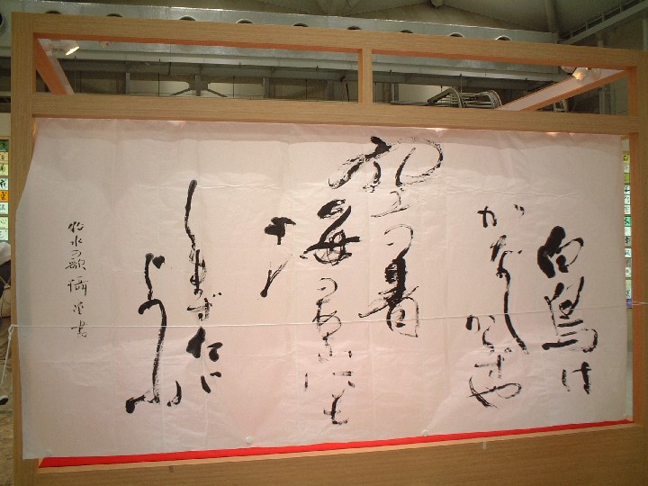 書の内容としては、八木重吉の詩を基調に、最後は誰もが知っている「白鳥は・・・」を、歌唱を交えて3.5m×1.8mの大きさの紙に大書しました。