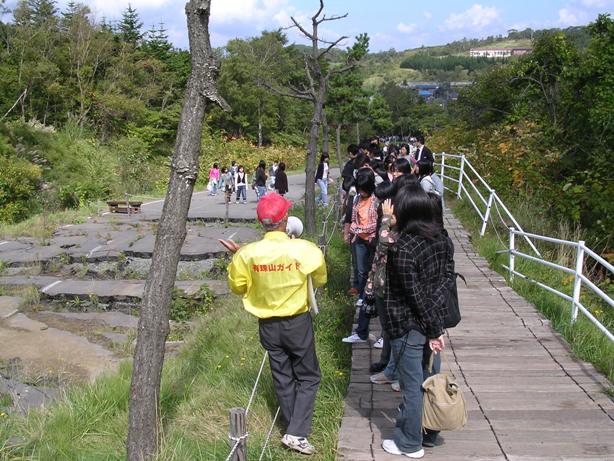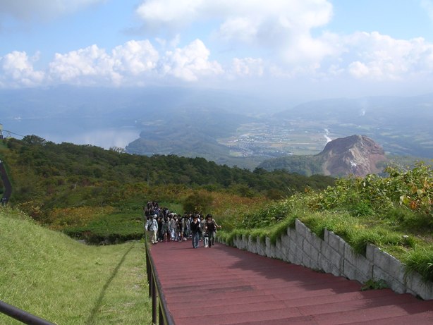 本日は、昭和新山・有珠山西山火口研修と、ニセコ体験学習を行いました。 ここでは、昭和新山・有珠山西山火口研修について報告します。 昭和新山を見学後、有珠山ロープウェイで山頂まで上がると、昭和新山はもとより、太平洋までもが見渡せる雄大な風景が眼下に広がりました。その背景をバックに、生徒達はたくさんの記念写真を撮っていました。 その後、有珠山西山火口へと移動し、現地のガイドさんの説明を聞きながら、2000年に起こった有珠山の噴火の様子と現在の姿を研修しました。活断層の見える道路や、水没した建物、破壊された菓子工場などを見て、生徒達は噴火の爪痕を目の当たりにしました。場所によっては、地表の温度が非常に高いところもあり、ガイドさんが温度計で地表の温度を測ると98度近くもあって、生徒達は温度計を覗き込むように見て、驚きの声を上げていました。