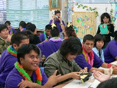 同校は、三重県高等学校文化連盟の招きによって来県したもので、41名の生徒、2名の指導者、12名の保護者が本校を訪れました。同校吹奏楽団は、6限目に体育館に集まった全校生徒の前で「タヒチタヒチ」「ハワイアンメドレー」などを演奏しました。それに続いて本校琴部の演奏、本校吹奏楽部との合同演奏と音楽による交流を行いました。短い練習時間にもかかわらず、両校の息のあった合同演奏には大きな拍手が起こりました。