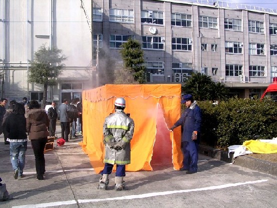 3学期の始業式が行われた本日、本年度2回目の避難訓練として、 津市北消防署の協力を得て「煙体験ハウス」を通過する体験をしまし た(写真)。 実際に体験した生徒は、各クラス5名ずつ合計140名でしたが、 ハウスの中にはいると煙で前が全く見えなくなるのには、一様に驚き の声が上がりました。 また、消防車が到着して煙体験ハウスの準備をしている時に、近く で実際の火災が発生し消防車が駆けつけるというハプニングもありま した。 火災は、幸いぼや程度で治まり、その後の防災講話では、署員の方 からその事についても触れて話していただきました。