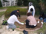藤棚前花壇の整備では、昨年に引き続きPTA役員の方のご協力を得て、花壇にパンジーの花とチューリップの球根を植えていただきました。 美化委員が毎日水をやりながら、花が咲くのを心待ちにしているようです。また、暖かい日には、花壇の周りで楽しそうにお弁当を食べている姿も見られ、生徒たちの憩いの場となっているようです。